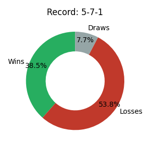 | 13 | 5 | 7 | 1 | 38.5% | 80.38 |