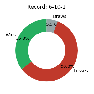 | 17 | 6 | 10 | 1 | 35.3% | 89.00 |