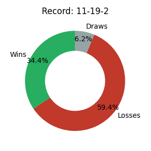| 32 | 11 | 19 | 2 | 34.4% | 86.53 |